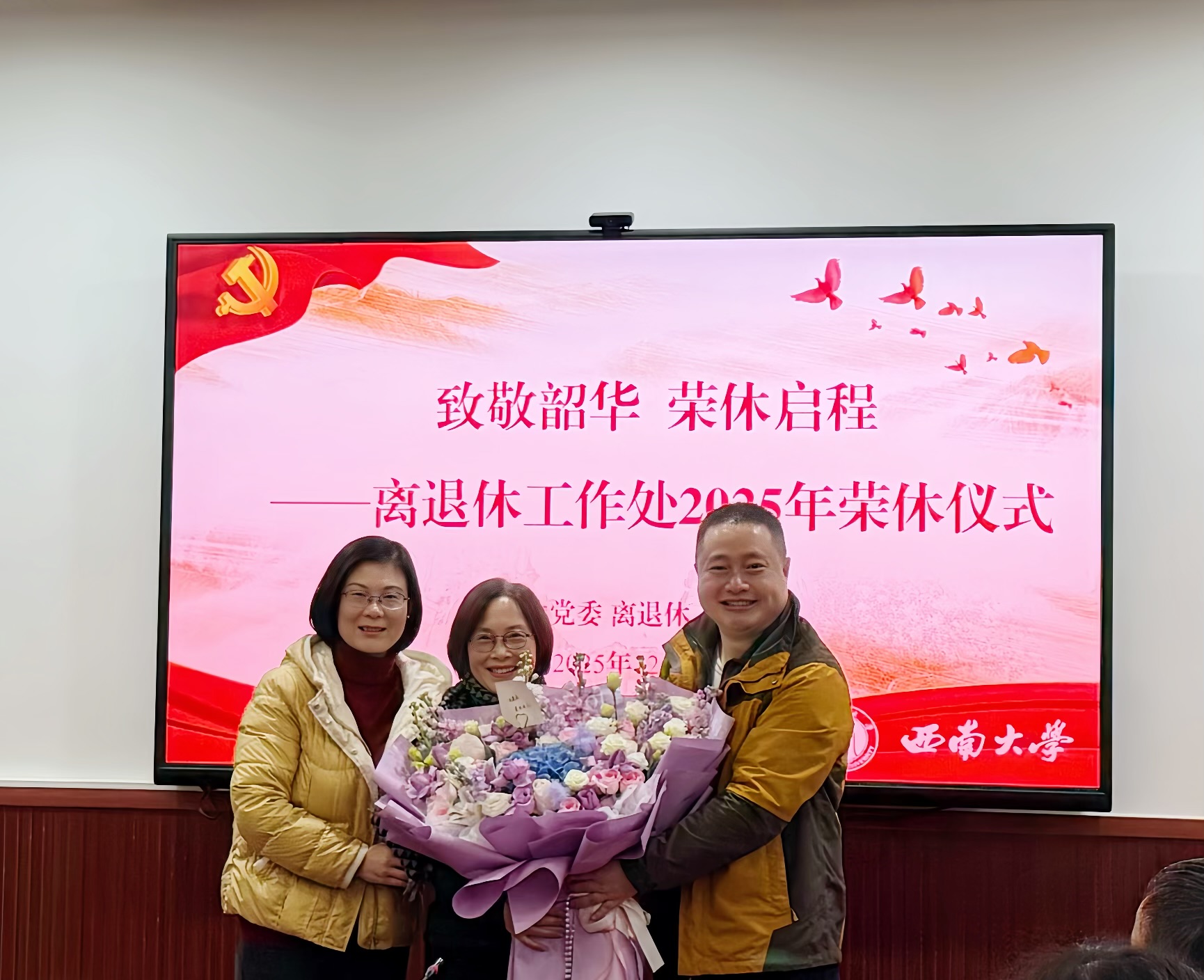 致敬韶华,荣休启程。2025年12月31日上午,离退休党委 离退休工作处为原副处长聂海霞同志举办荣休仪式。仪式由副处长冉秦鸿主持。聂海霞同志回顾了自己三十八年的工作经历,分享了服务老同志过程中的温暖点滴,并表示“离岗不离党、退休不褪色”,继续关注和支持学校离退休工作。党委书记余小蓉、党委副书记兼纪委书记熊伟代表全体同事向聂海霞同志献上鲜花,表达诚挚敬意与美好祝福。与会同事纷纷发言,感谢聂海霞同志多年来的...