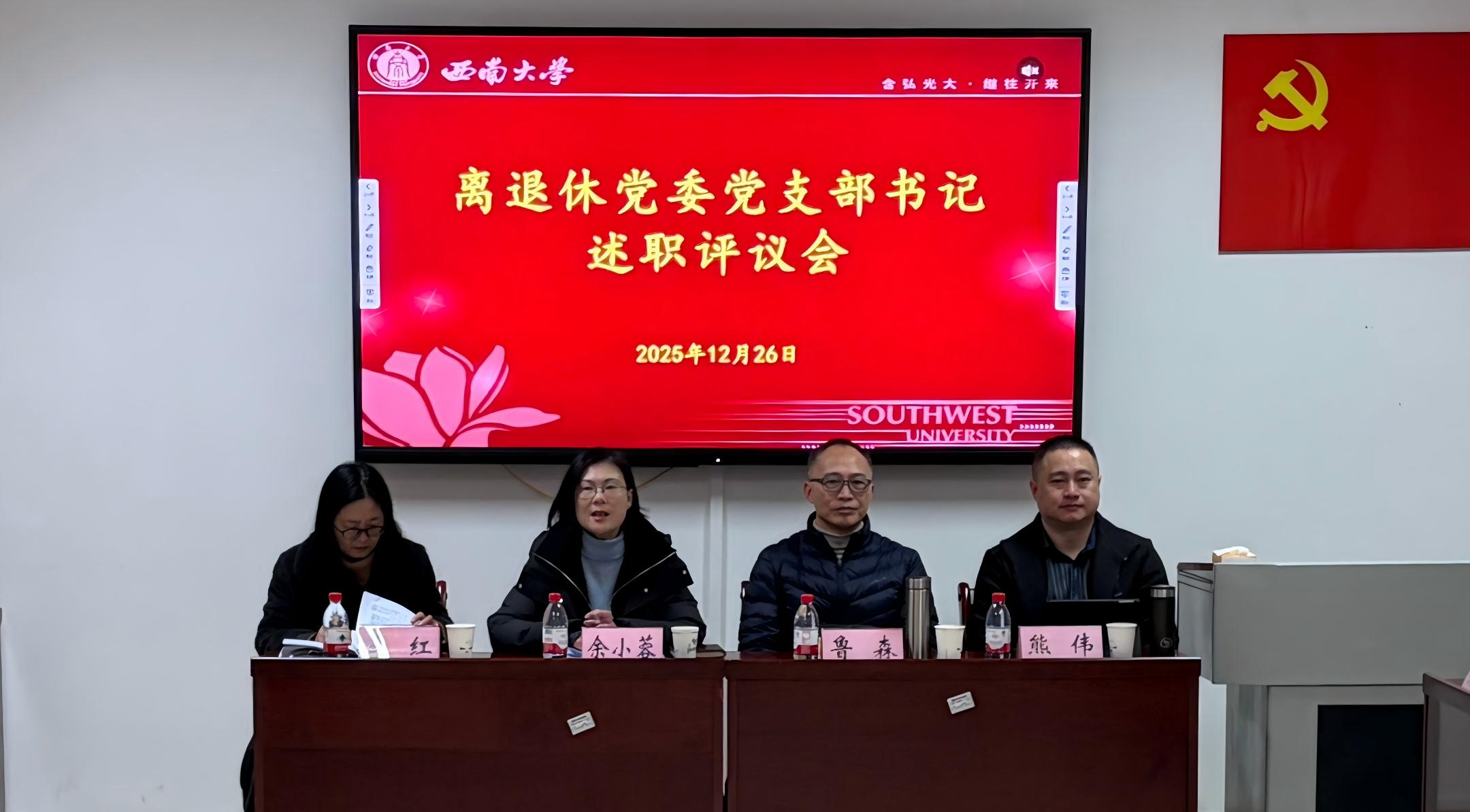 12月26日,离退休党委在教职工活动中心201召开2025年党支部书记述职评议会,离退休工作处处长鲁森,离退休党委正处级组织员李红,离退休党委副书记、纪委书记熊伟,离退休党委委员、纪委委员及各党支部书记参加会议。会议由离退休党委书记余小蓉主持。