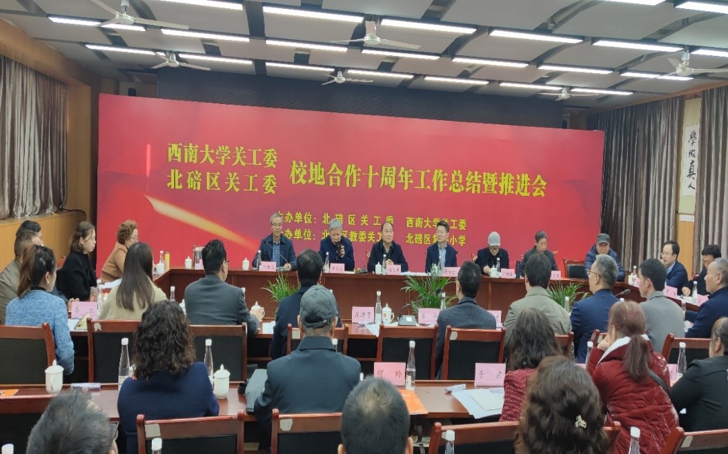 近日,西南大学关工委、北碚区关工委“校地合作十周年工作总结暨推进会”在复兴小学召开,重庆市关工委副主任韩国涛、市教委关工委常务副主任邓朝喜、西南大学关工委常务副主任宋乃庆、北碚区关工委常务副主任张遇鸣以及北碚区和西南大学有关单位主要领导、中小学校长等参会。会议由北碚区人大常委会副主任朱吉红主持。