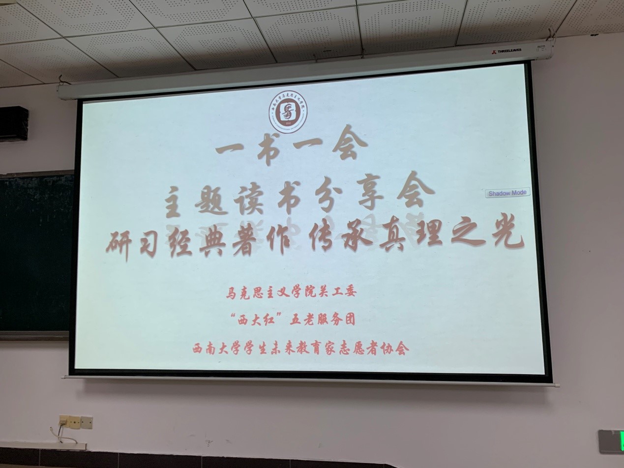 为深入学习贯彻习近平新时代中国特色社会主义思想,传承马克思主义经典著作的真理力量,3月14日下午,西南大学马克思主义学院“研习经典著作·传承真理之光”第十三届一书一会主题读书分享会决赛在第十教学楼501教室成功举办。“西大红”五老服务团成员、马克思主义学院关工委副主任曾光霞副教授、何红连副教授,西南大学学生未来教育家志愿者协会指导教师宣明珠担任决赛评委,学院本科生代表及未协全体成员参与活动。