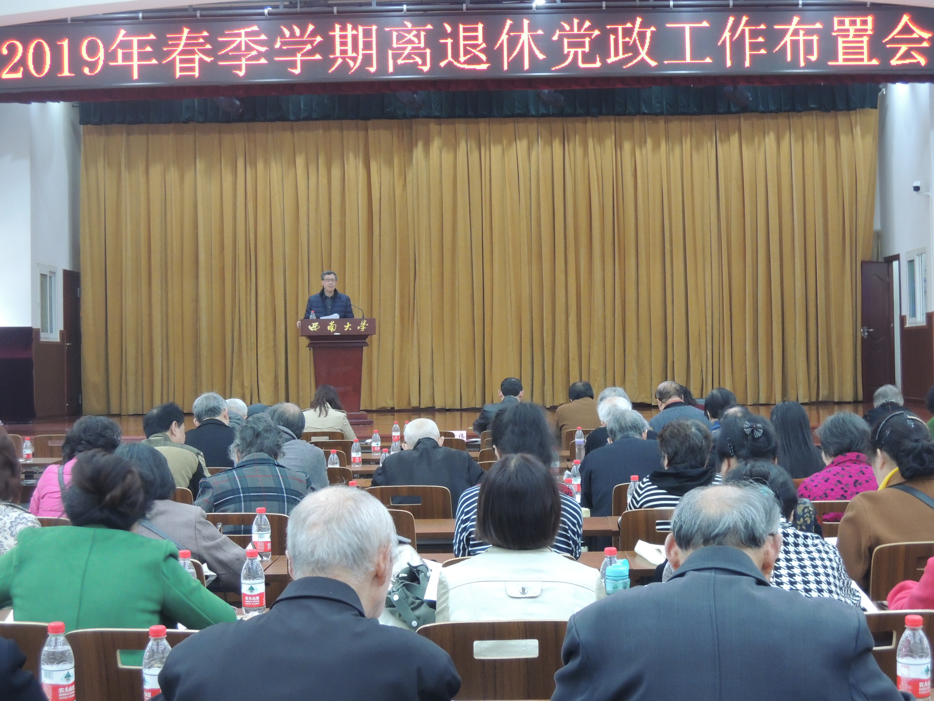 3月20日,2019年春季学期离退休党政工作布置会在教职工活动中心多功能厅举行。离退休工作处处长李素伟,党委副书记、纪委书记周厚彬,副处长聂海霞、陈文真,离退休党委委员、纪委委员、党支部书记及支委、退休行政小组长等160多人到会。会议由离退休党委书记廖万洪主持,共分两个阶段进行。